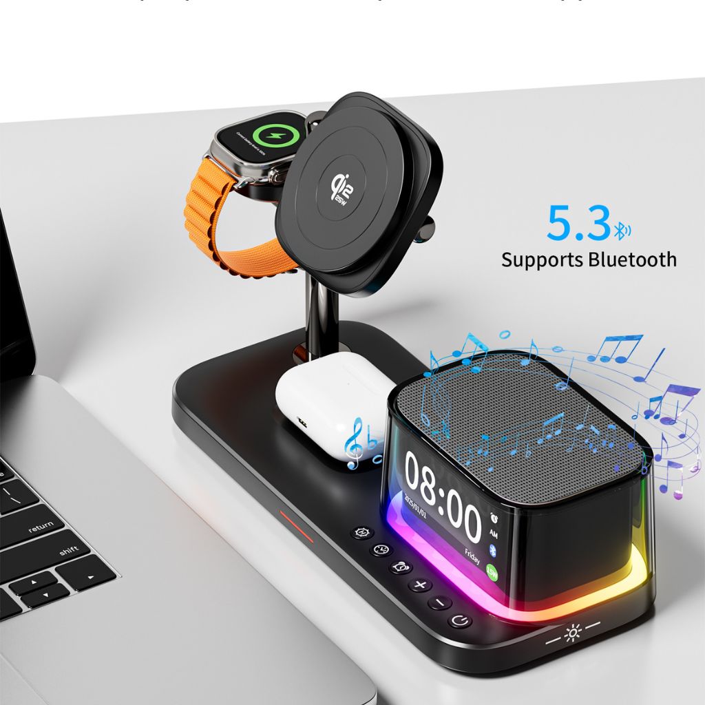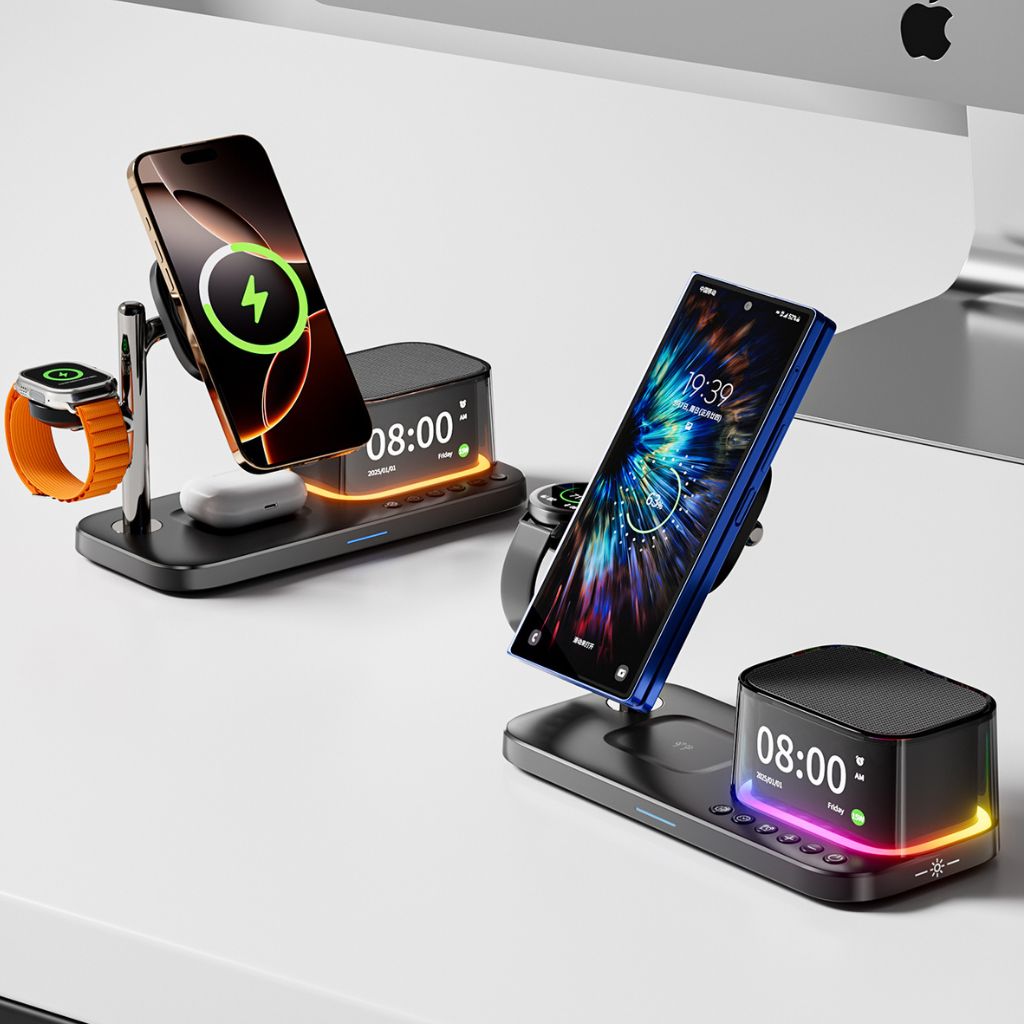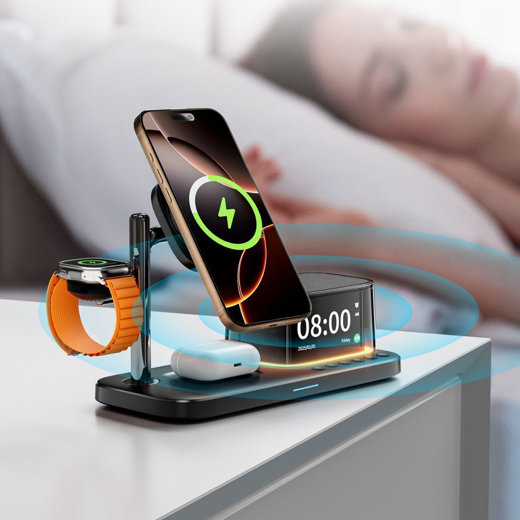 Magnetic Qi2.2 25W charging with built-in speaker and smart alarm.